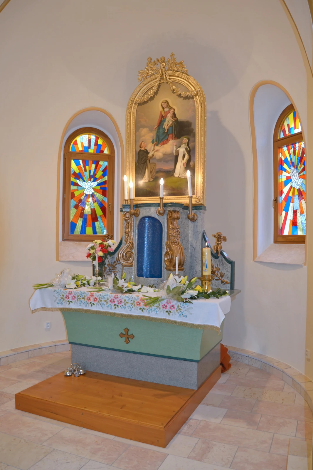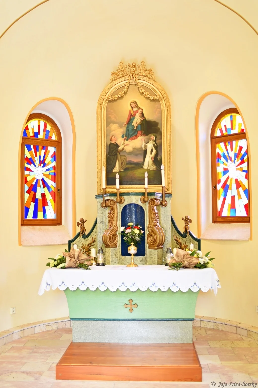 Oltár tvorí obraz Ruženec Panny Márie od maliara J. B. Klemensa z roku 1877. Kaplnka bola slávnostne vysvätená 30. septembra 1877, na nedeľu Ružencovej Panny Márie, za veľkej účasti veriacich.